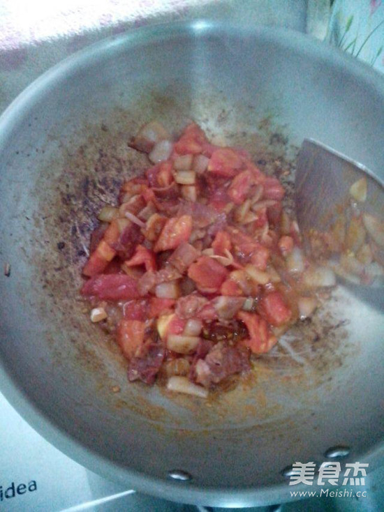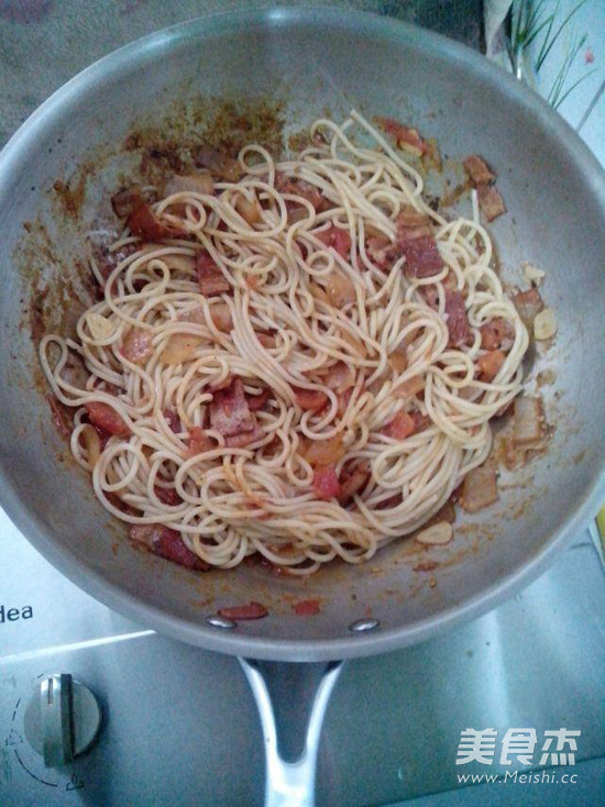 调制中火,倒入已经用清水煮熟的意大利面,大概炒5分钟即可,放1勺食盐即可出锅装盘