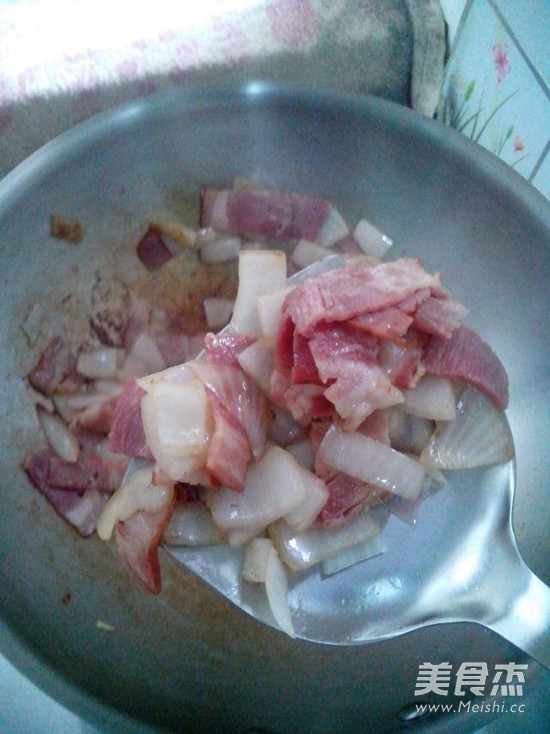 锅烧热,放入火麻油,油热后倒入五花肉和洋葱一起炒熟