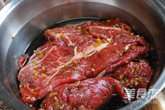 手忙脚乱的,忘记拍牛肉腌制图,牛肉切大片,放在面板上用肉锤或者刀背拍松,放入黑胡椒粉、蚝油、食盐腌制30分钟