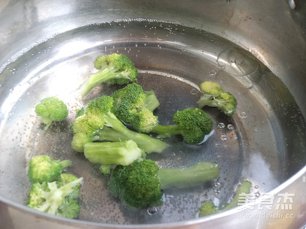 煮锅加水烧开,加少许盐、油,成淡油盐水,西兰花入锅焯水后捞出沥干水。