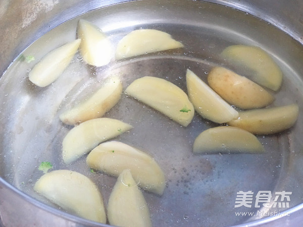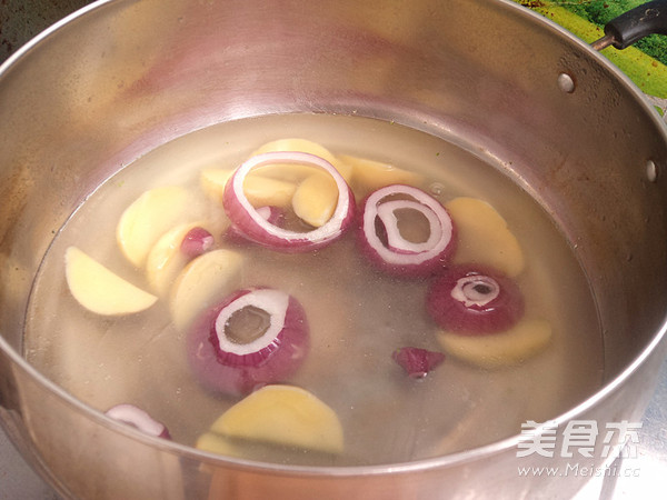 煮熟土豆后将洋葱入锅,关火,捞出土豆、洋葱沥干水